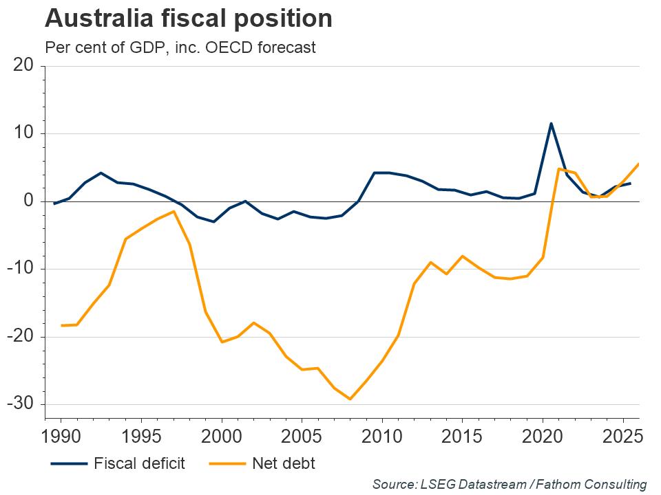 This backdrop suggests serious headwinds for Australia’s public finances. This week, Treasurer Hockey said that “there has been a hit to the budget” from lower iron ore and coal prices, frustrating the authorities’ effort to move public finances back into the black. As result, the government is likely to revisit its forecast of a A$30 billion deficit for the current fiscal year, following the shortfall of A$50 billion recorded in the twelve months to June. What is more worrying, in our view, is Mr Hockey’s conviction that the Chinese government will not “permit … a significant economic deterioration from what is near 7.5% growth”. This year, he may have a point. But next year is much harder to judge. We see around a one in three chance that China is already in a hard-landing scenario. If this risk materialises, growth next year is likely to be in the low single digits at best.