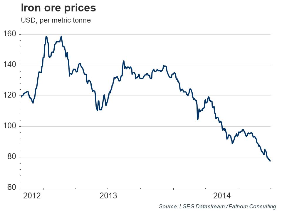 Skyrocketing base metal prices in the past decade led to substantial overinvestment in the Australian mining industry, with iron ore production up more than 40% over the past four years. At the same time, the large producers seem prepared to engage in a price-war aimed at forcing their smaller, higher cost competitors into distress. BHP Billiton recently said that it plans to ramp up iron ore output, despite acknowledging that supply growth would exceed demand ‘in the short to medium term’, and Rio Tinto confirmed that it would go ahead with a planned expansion of mining production. So not only has global demand for Australia’s key natural resource fallen, that country’s ability to extract it has, with characteristic bad timing, risen too, putting further downward pressure on prices.